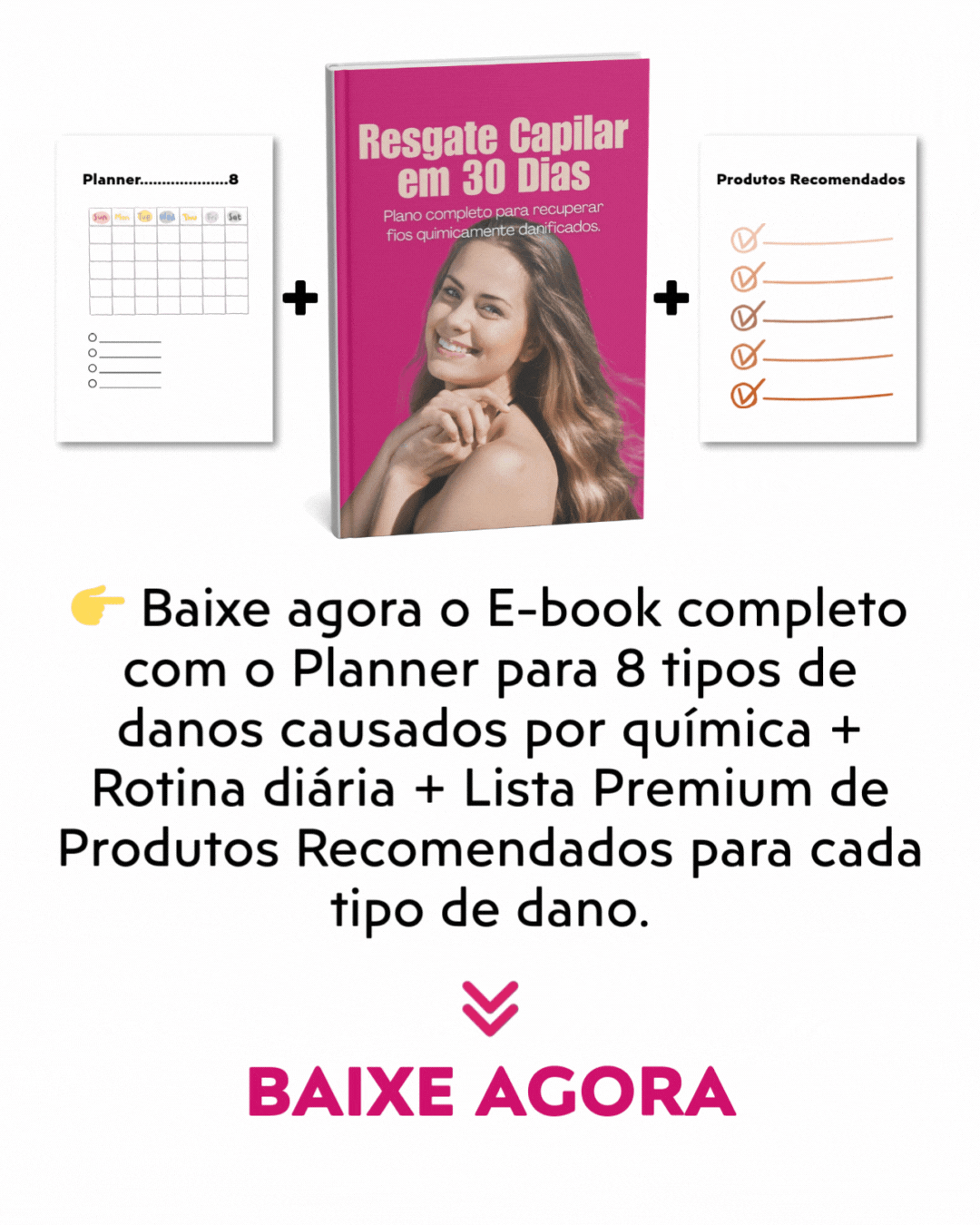 👉 Adquira o E-book completo com o Planner para 8 tipos de danos causados por química mais o Checklist Premium de Produtos Recomendados para cada tipo de dano (com links práticos para comprar direto online). Assim você não perde tempo escolhendo e ainda economiza.